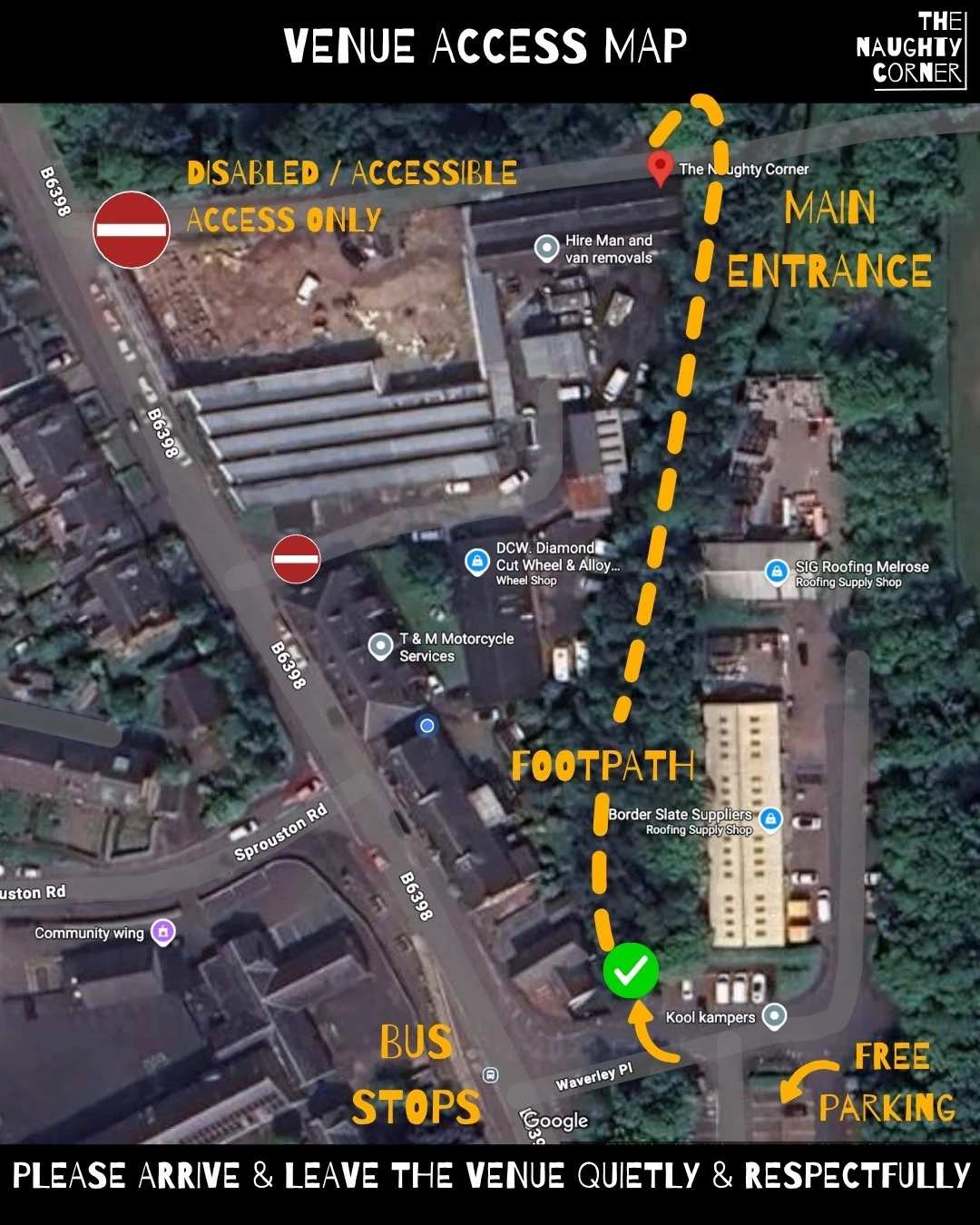 From the A68, Turn left/right onto Earlston Rd/B6398, carry on up the road and turn left onto Waverly Place to find the large public parking. Search for kool kampers in your maps for parking. The is a pedestrian footpath that leads along the old railway line to the venue entrance.